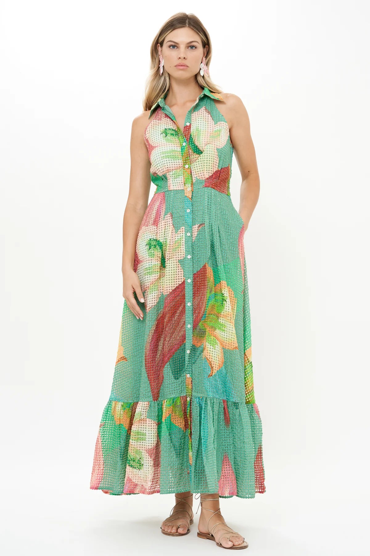 Transport yourself to the tropics with hibiscus flowers splashed across the tranquil sage background of the Sleeveless Shirt Dress Maxi. Breezy open weave cotton provides a subtle sheen for an extra eye catching effect.
