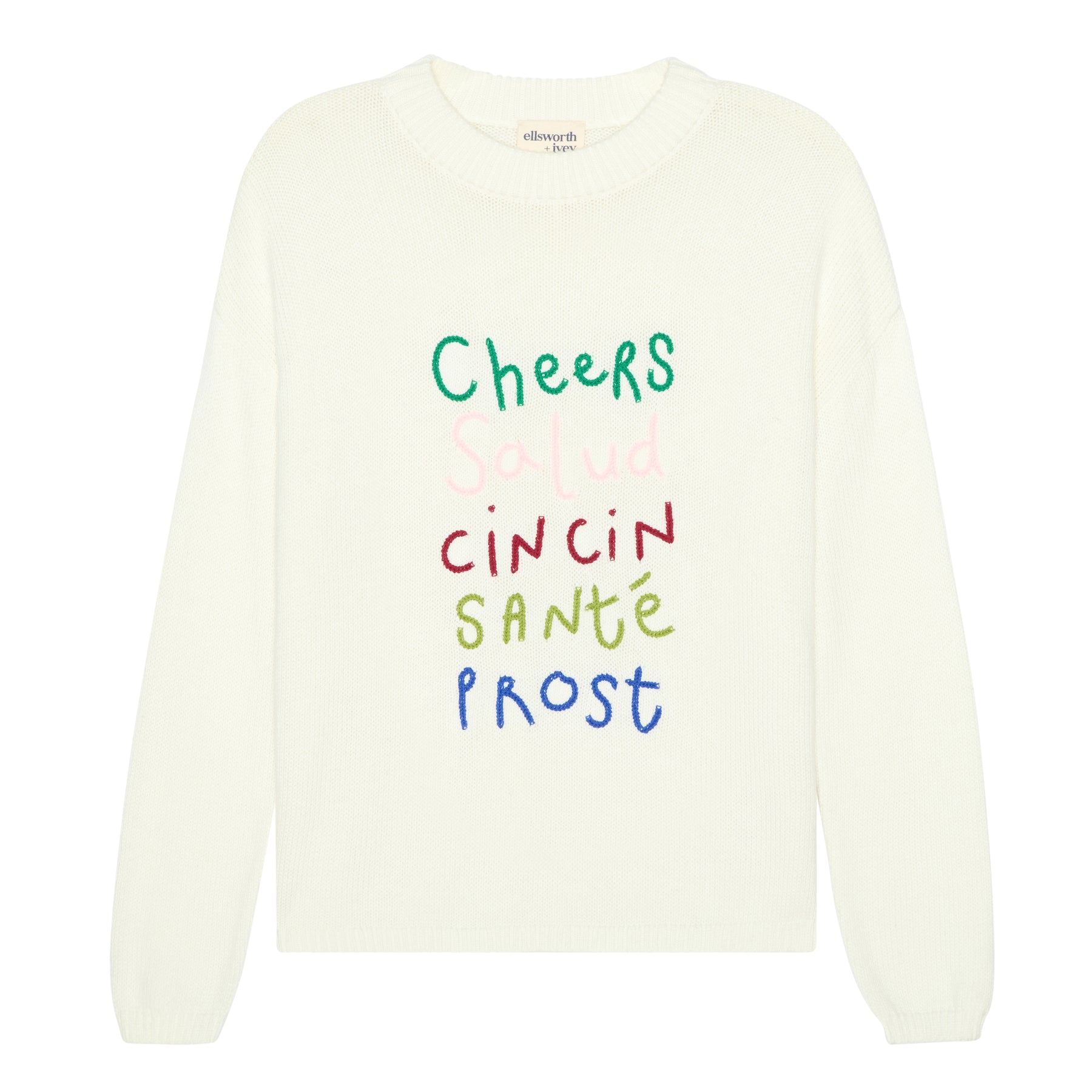 Represent all things holiday in the Sadie Crewneck Sweater - World Cheers! Featuring various sayings in multicolored embroidery, this cozy favorite is sure to be a conversation starter at your holiday gatherings. We love this style with a baggy jean and red ballet flat!