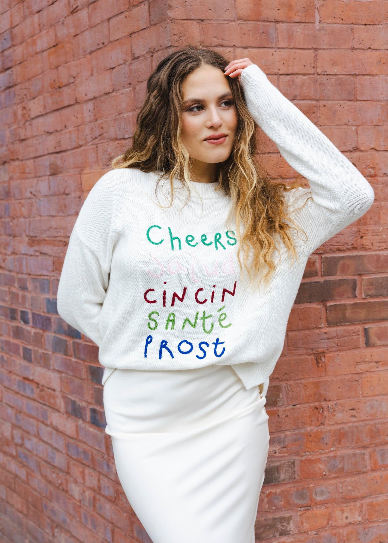 Represent all things holiday in the Sadie Crewneck Sweater - World Cheers! Featuring various sayings in multicolored embroidery, this cozy favorite is sure to be a conversation starter at your holiday gatherings. We love this style with a baggy jean and red ballet flat!