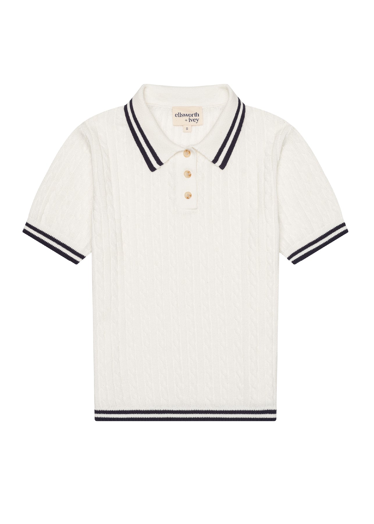 Finish the course in style with the Grace Cableknit Polo! A fresh, color-blocked take on a classic short sleeve polo with collar buttons, ribbed collar, and