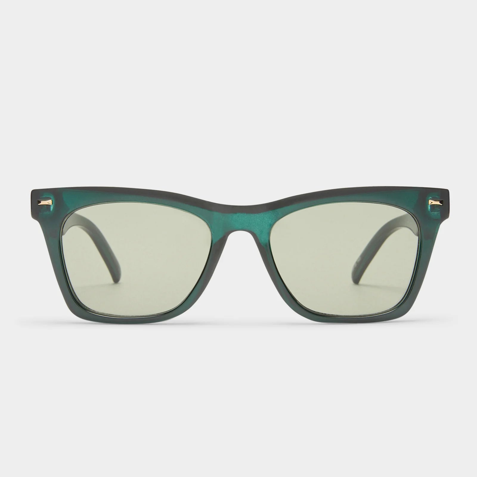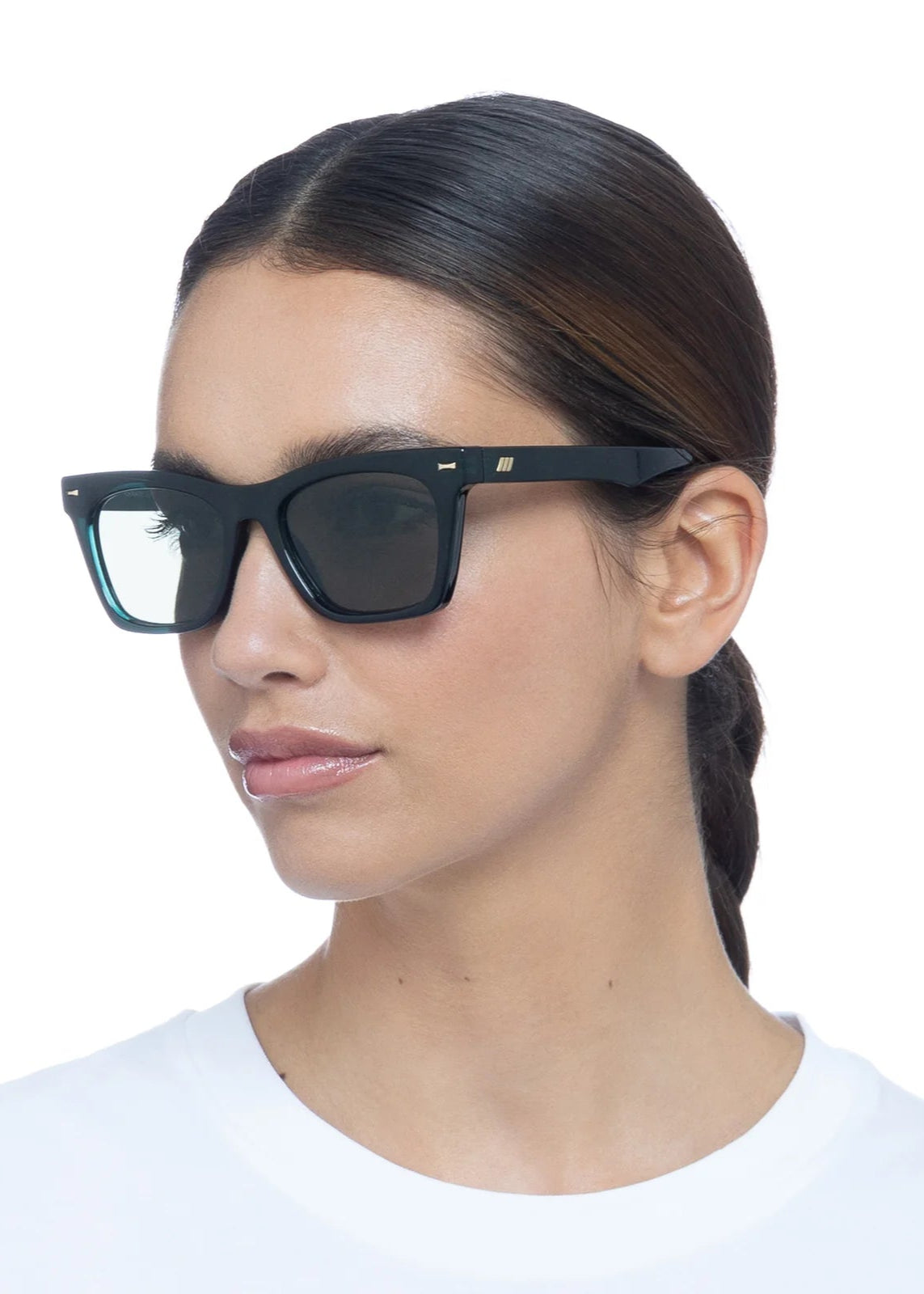 Sharp and luxurious, our CHANTE sunglasses set a contemporary mood for everyday wear. Designed with a wide fit and midsize profile, this slightly swooping D-frame silhouette ideal for all face shapes features discreet rivet detailing and Le Specs flagstripe metal hardware.