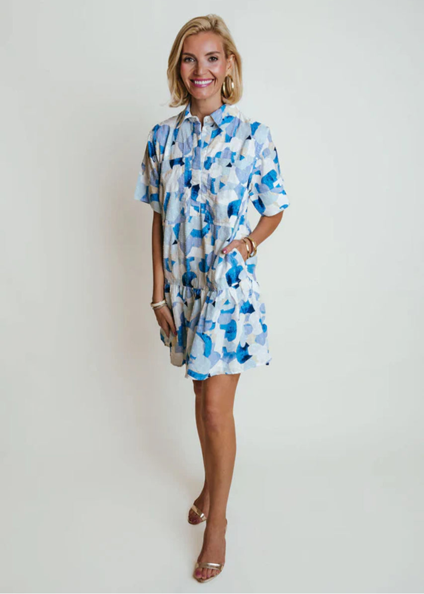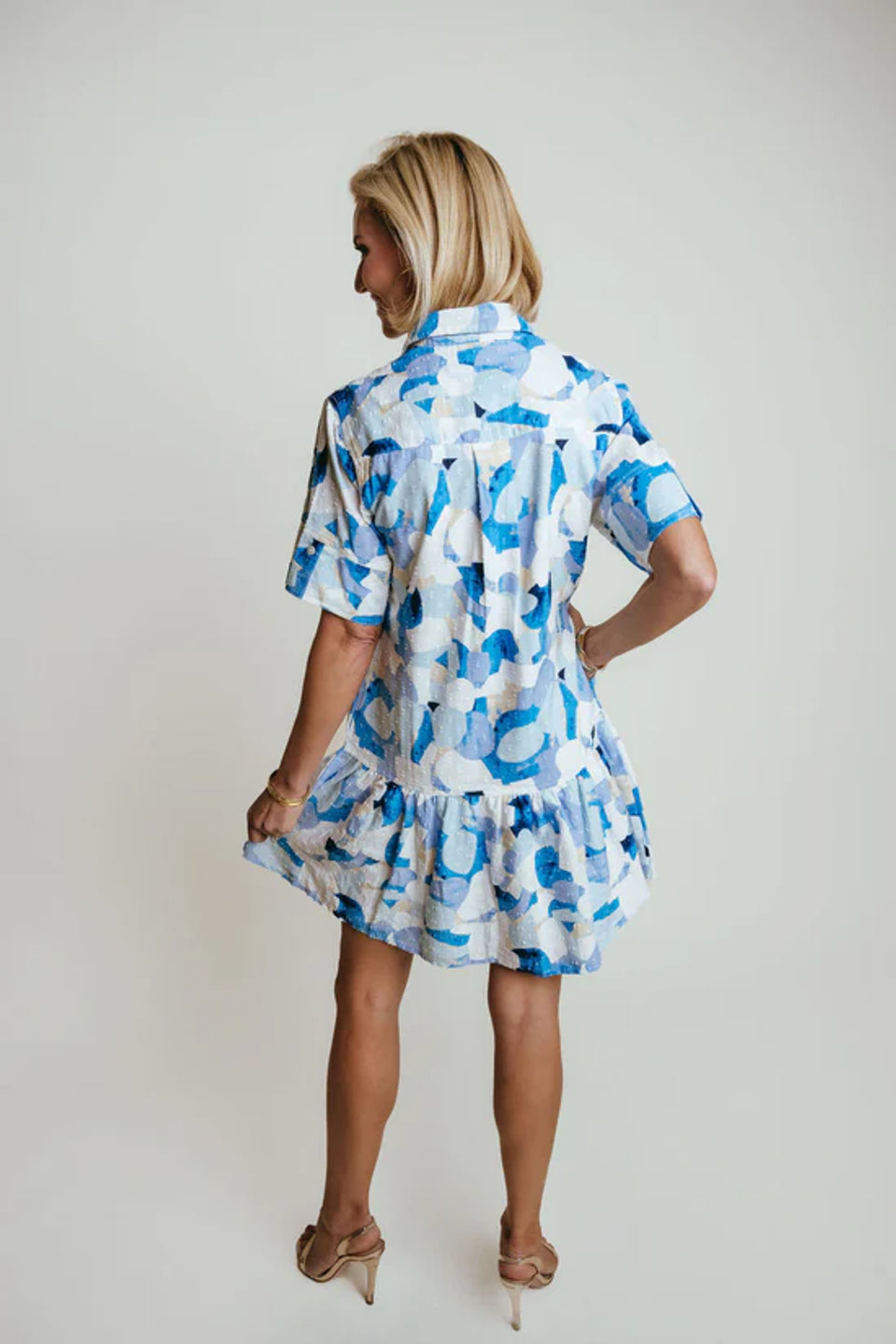 The perfect mini dress for those warmer months. Introducing the Lola Dress by LAROQUE, a stunning piece in vibrant Sea Pebble print, perfect for any occasion. This elegant mini dress features elbow sleeves and a shirt silhouette, crafted from luxurious cotton poplin. Its collared v-neck and playful ruffle hem add a unique touch, while the button closure ensures a flattering fit.