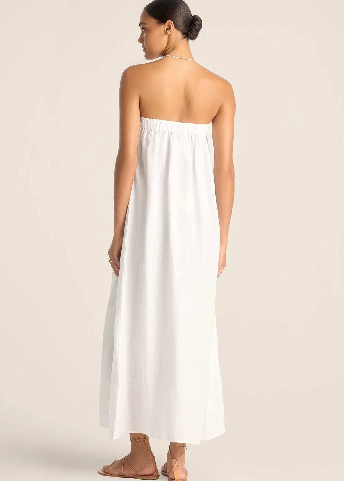 Soleil is an effortless, full length, strapless linen dress that features a wide, elasticated neckline and side seam pockets.